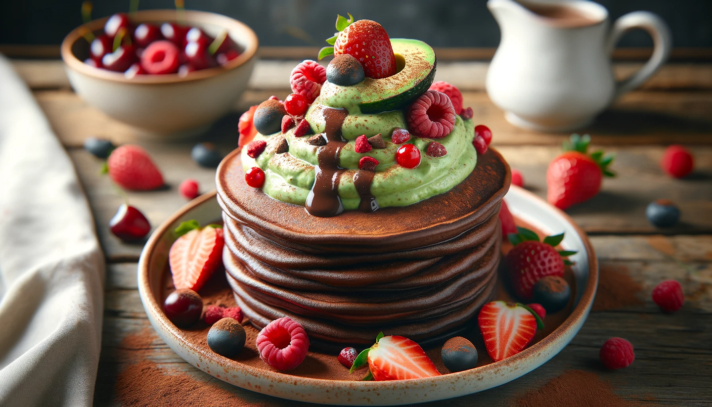 Un dessert goloso ma nutriente: Pancake proteico al cacao con mousse di avocado e frutti rossi.