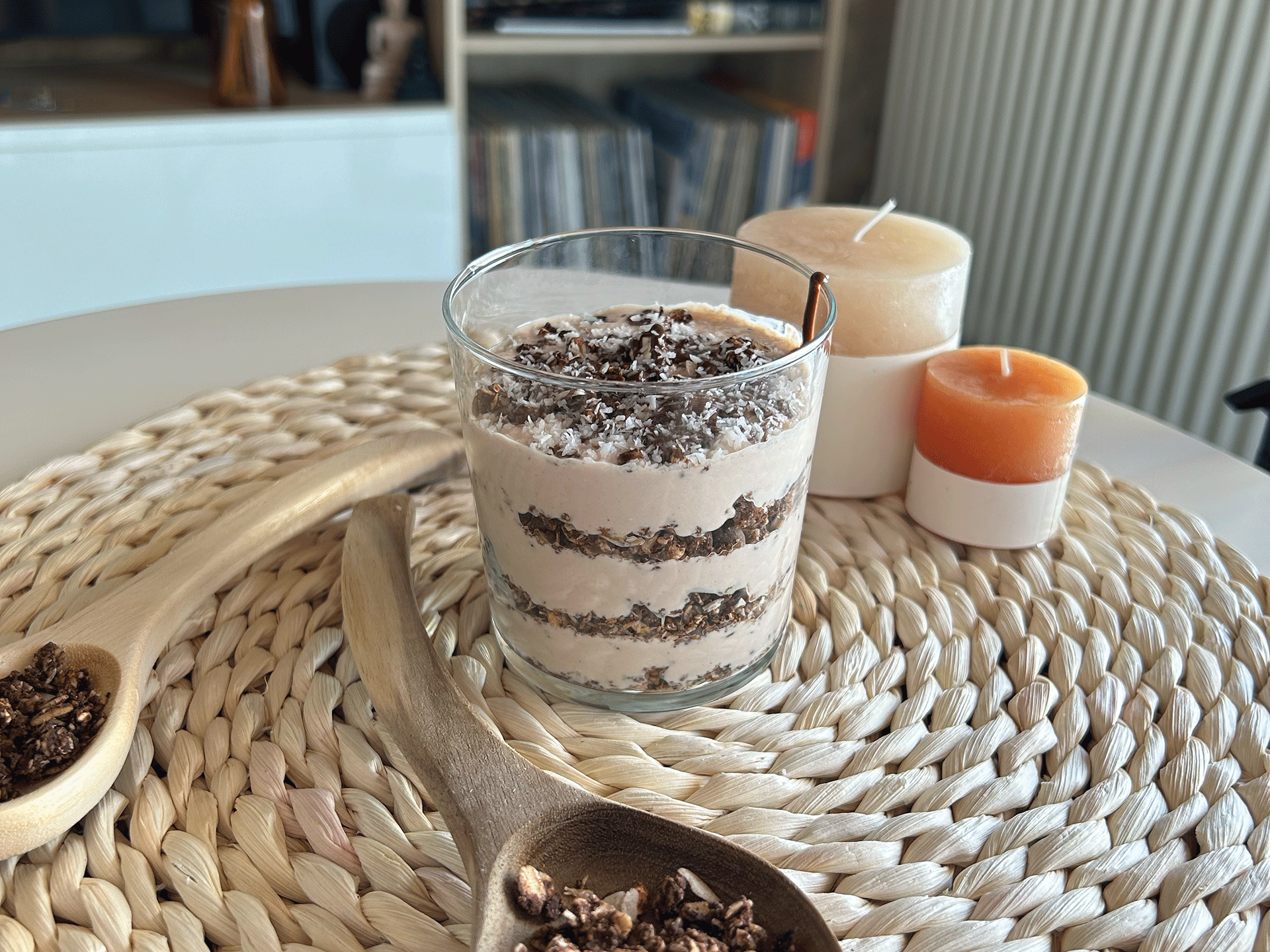 Infine ti basta prendere un bicchiere o un contenitore a tua scelta e creare quindi il semifreddo alternando il composto con lo yogurt e la Granola. Per finire, cola in cima la crema proteica e il cocco rapè.